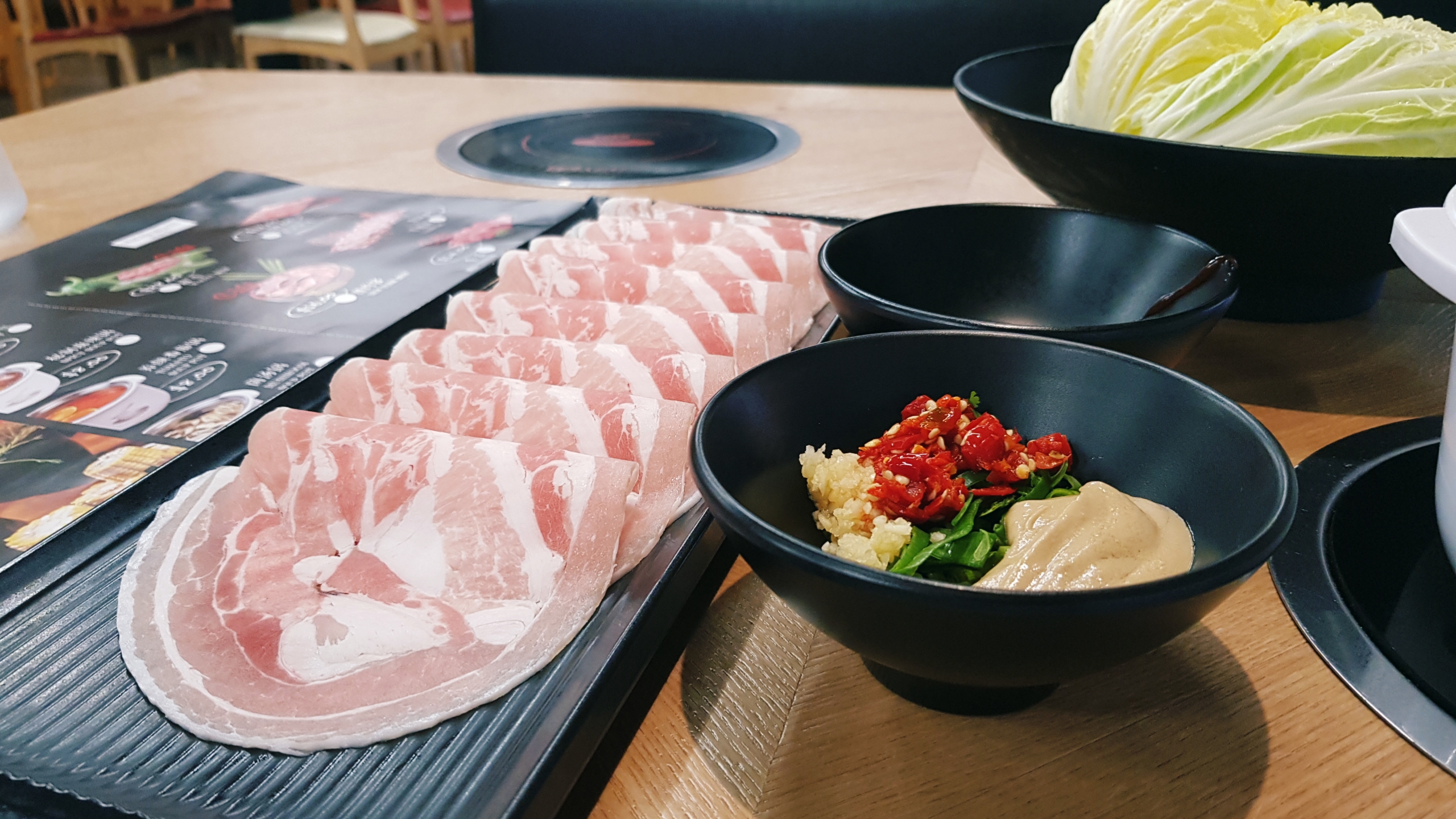 คือมีให้เลือกหลากหลายชนิดมากนี้เลย นี้สั่งเนื้อหมู ผักกาด ไข่ ข้าว พนักงานแนะนำให้เลือกสูตรดั้งเดิม ก็ไม่รู้สึกผิดหวังนะ อร่อยมากๆ ยิ่งตอนต้มๆไป ซุปเข้มข้นขึ้นก็รสชาติอร่อยมากๆ แบบฟินๆ ส่วนน้ำจิ้มกับเครื่องเคียงจำพวก ผักชี ต้นหอม กระเทียมสับละเอียด พริก จะอยู่ข้างหน้าร้านต้องไปตักเอง เราเลือกซอสเสฉวนเอามาผสมน้ำซุปนิดหน่อย ใส่ผักชีกระเทียมต้นหอม ตักผสมน้ำซุปและขอมะนาวจากทางร้านมาใส่นิดหน่อย ได้ซอสรสชาติสุกี้บ้านเราเลย สั่งไปสักพัก พนักงานก็มาเสริฟ์ แบบรอไม่นาน