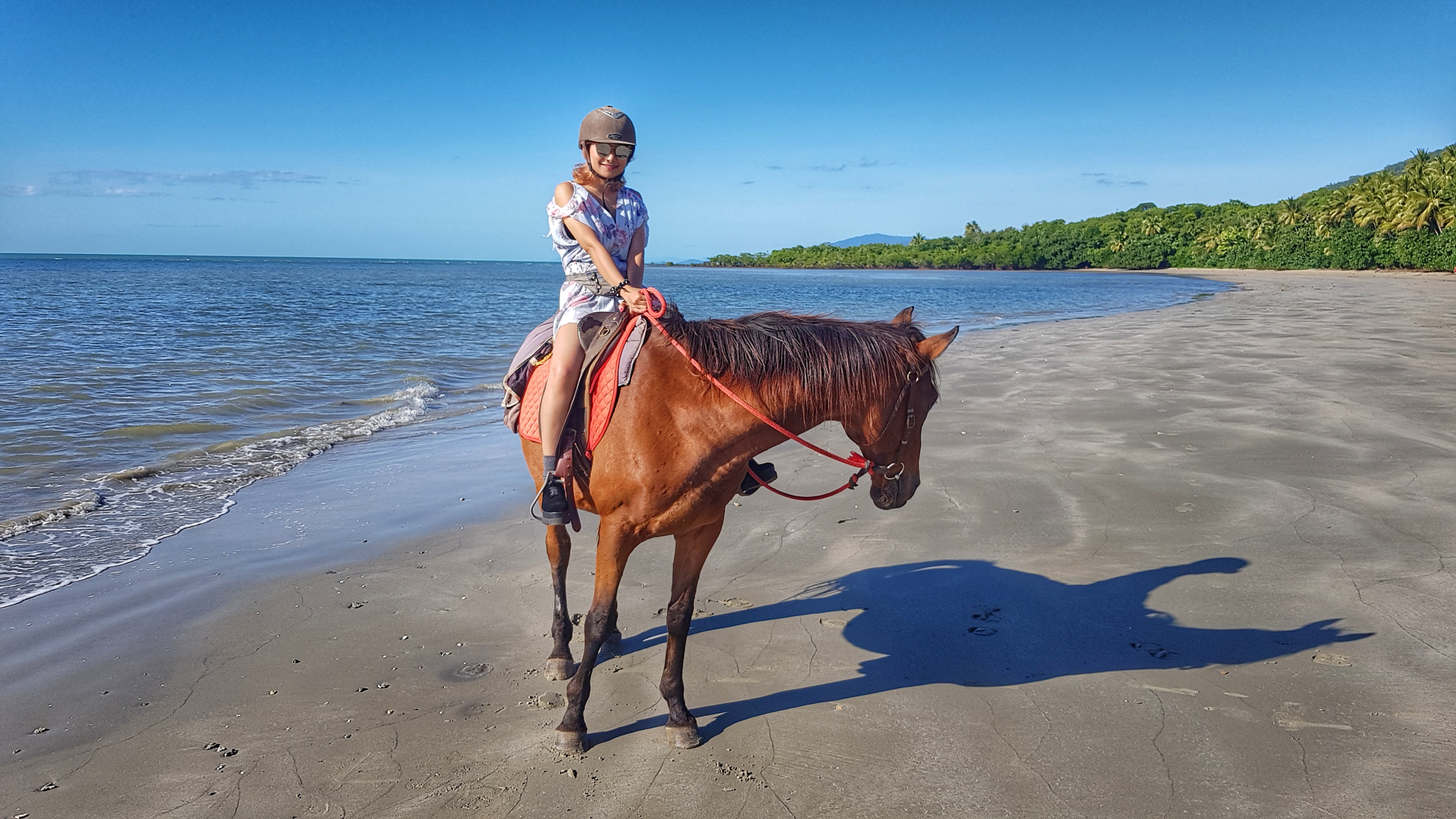 สุดท้ายเลยได้อยู่ต่อจากหัวขบวนก็ผ่านเข้าไปในป่าฝนที่มีอายุเก่าแก่ที่สุดในโลก ผ่านลำธารที่จระเข้ว่ายเฉิดฉายไปเรื่อยๆแบบชิวๆ ก็สวยดี ฮ่าๆ สำหรับคนที่ชอบอยู่ท่ามกลางธรรมชาติต้องลองไปดูคะ สักพักพอถึงทางตรงในป่า ผู้ดูแลก็สอนควบม้าให้วิ่ง ก็ใช้มือหนึ่งดึงเชือกให้ตึงนิดหน่อยแล้ววางมือทับเชือกไว้บนหลังคอมาและอีกมือจับบนอานม้าด้านหลัง โฮ๊ะๆ ตัวนี้โยกเยกแบบกระแทกไปมาตามแรงม้าเลยจ้า ระบมไปทั้งตัวเลยนิ พอออกจากป่าก็เดินไปตามชายหาด สวยมากๆ ท้องฟ้าสดใส อากาศดี ลมพัดอ่อนๆ คือรู้สึกดีสุดๆเกินบรรยาย